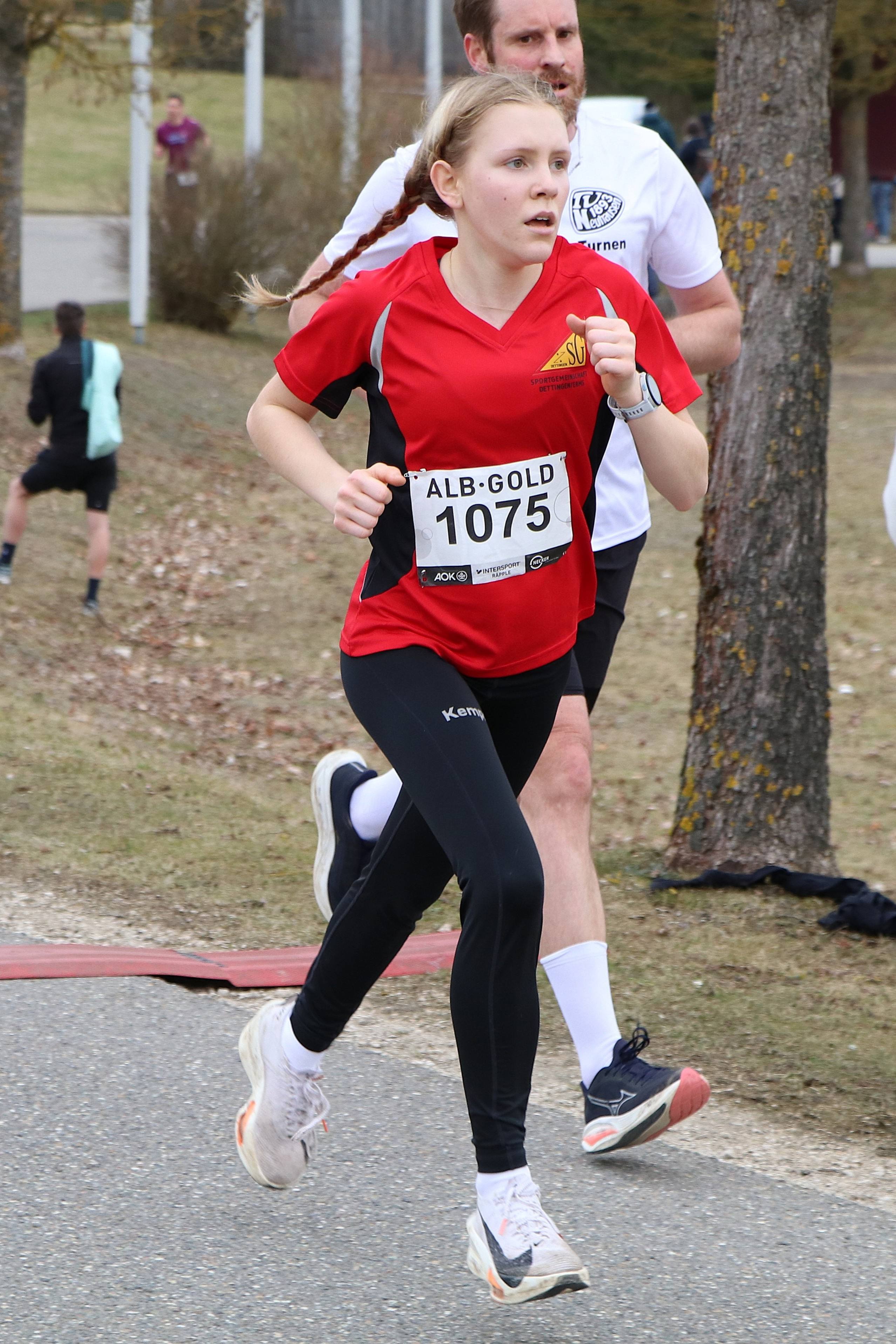 Line Seitz mit starker Verbesserung auf der 10km- Runde beim Albgoldlauf 2 in Pliezhausen- Gniebel. Nach dem Auftakt in Reutlingen mit Bestzeit der W18 und selbst erst 15 Jahre alt, aber mit großer Vorliebe auf einer Langstrecke, war dies als 15. Von fast 200 Läuferinnen eine sehr gute Vorstellung und Einstand bei ihrer SG Dettingen. Auch bei der zweiten Laufveranstaltung des Winterlauf- Cups „Albgold“ in Pliezhausen- Gniebel, ging sie wiederum auf der 10km- Runde an den Start. Wiederum war sie dem Tempo der Altersklasse W 18 und W 20 Damen gewachsen. In 44.06min war dies eine weitere Steigerung ihrer Laufleistung und gewann diese beiden Altersklassen in sehr beachtlicher Zeit auf der 10km- Distanz!